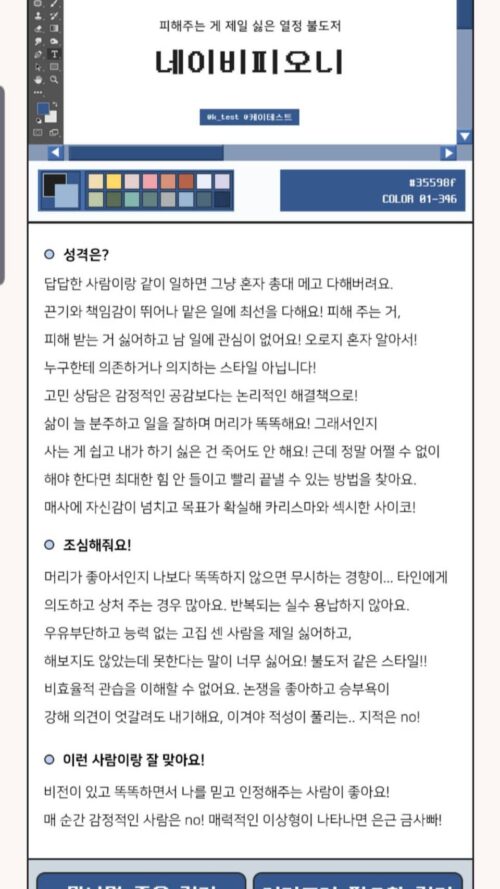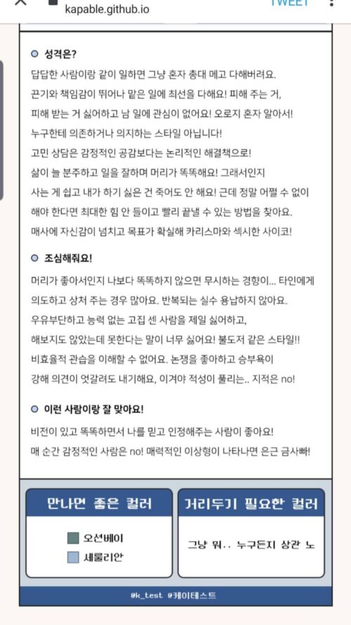 息苦しい人と一緒に働くならただ1人で力んで全部してしまう。 忍耐と責任感に優れ、まかされた仕事に最善を尽くします! 被害を与えること、被害を受けることが嫌いで 他人のことに関心がありません! ただ1人で!誰かに頼ったり、頼られたりするスタイルではありません!! 悩み相談は、感情的な共感よりも論理的な解決策を!! 人生がいつも忙しく仕事をよくして、頭が賢い! そのためか、生きるのが容易で、やりたくないことは死んでもやりません! でも、本当にどうしようもなく必要がある場合は、最大限、力を入れずに早く終わらせることのできる方法を探します。 何事にも自信に満ち、目標がはっきりしているカリスマとセクシーなサイコ!