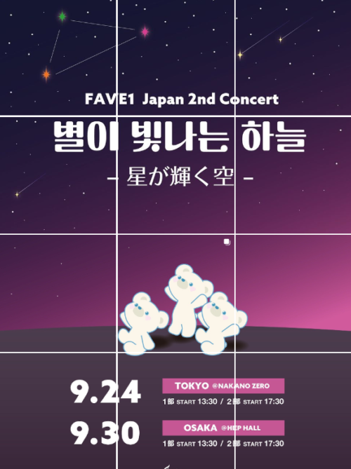 ★SNS 230808 X・インスタグラム訳 2023-08-08 ◇ヒョクジン インスタストーリー ◇FAVE1 インスタグラム 【🪐】 #FAVE1 2nd Concert ✰ ✰ ✰ 별이 빛나는 하늘 星が輝く空 ✰ ✰ ✰ 📍2023.09.24 🗺Nakano Zero 📍2023.09.30 🗺️Hep Hall #페이브원 #록현 #종환 #찬용 #혁진 スポンサーリンク