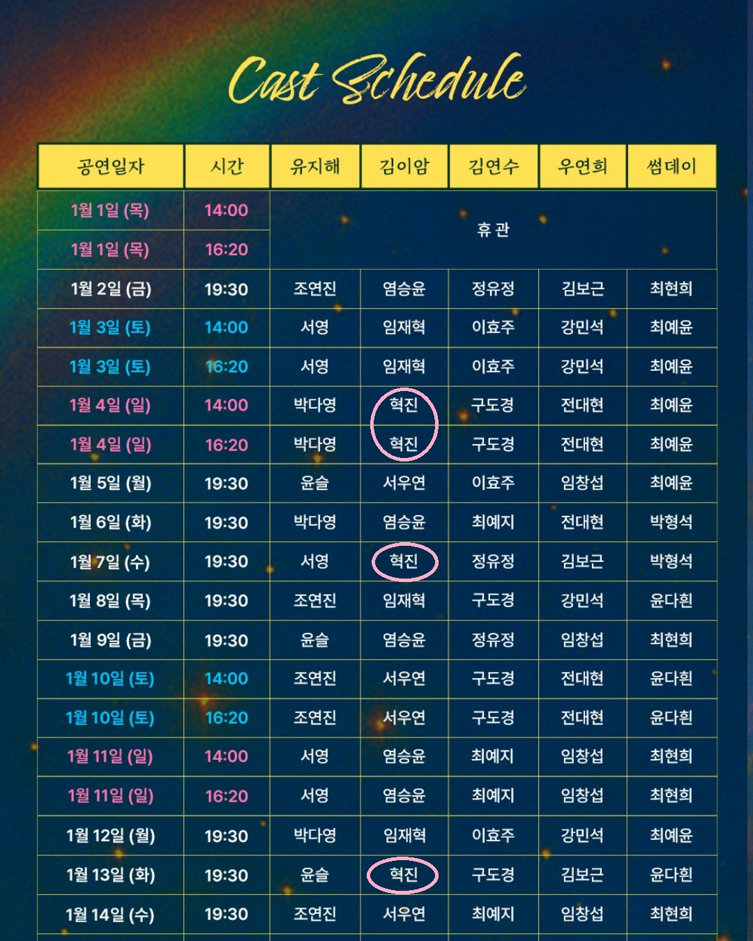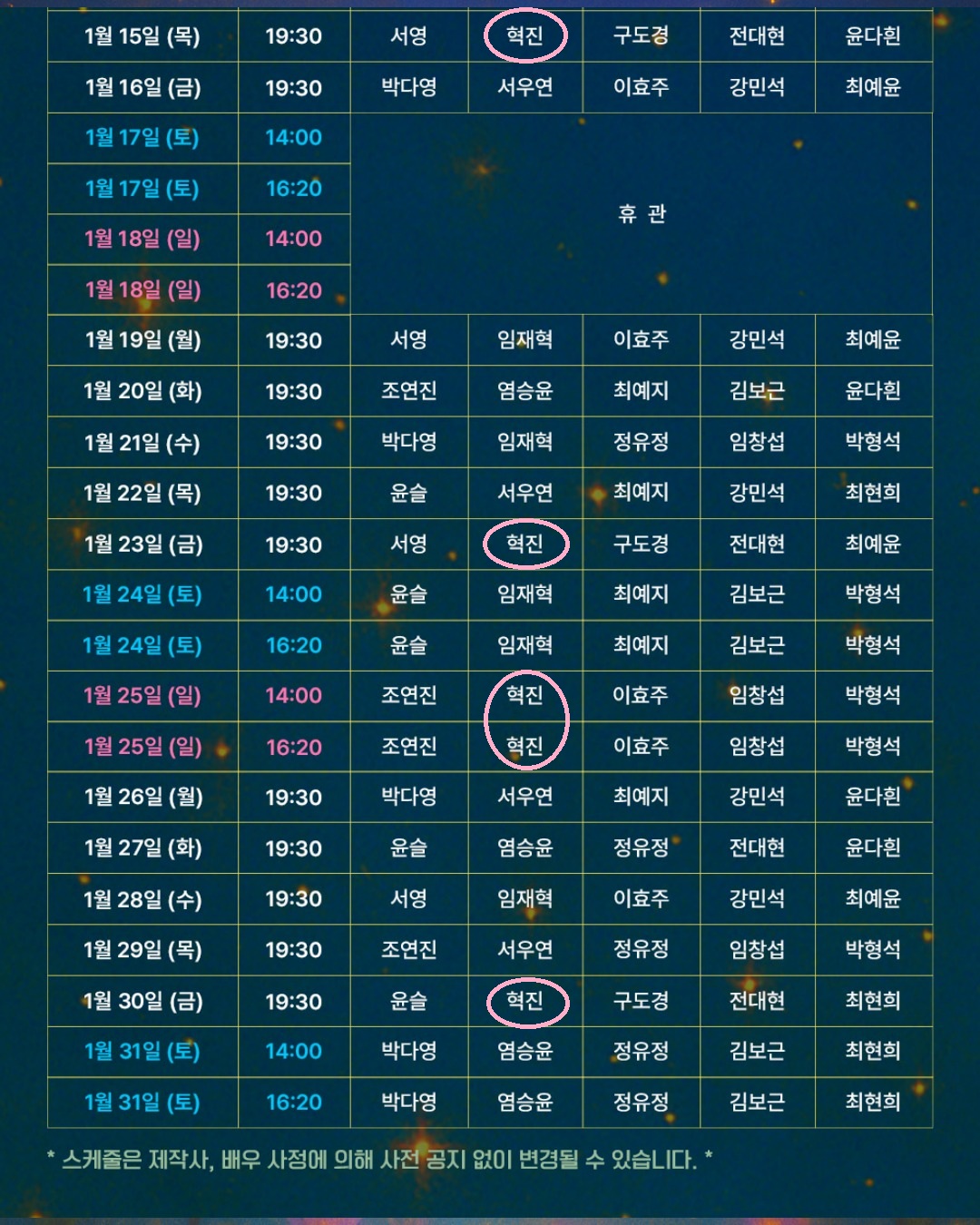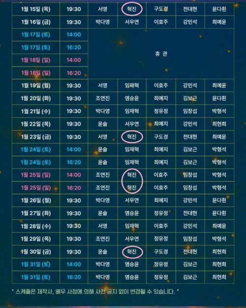 *스케줄은 배우, 제작사의 사정에 의해 사전 공지 없이 변경될 수 있습니다.*