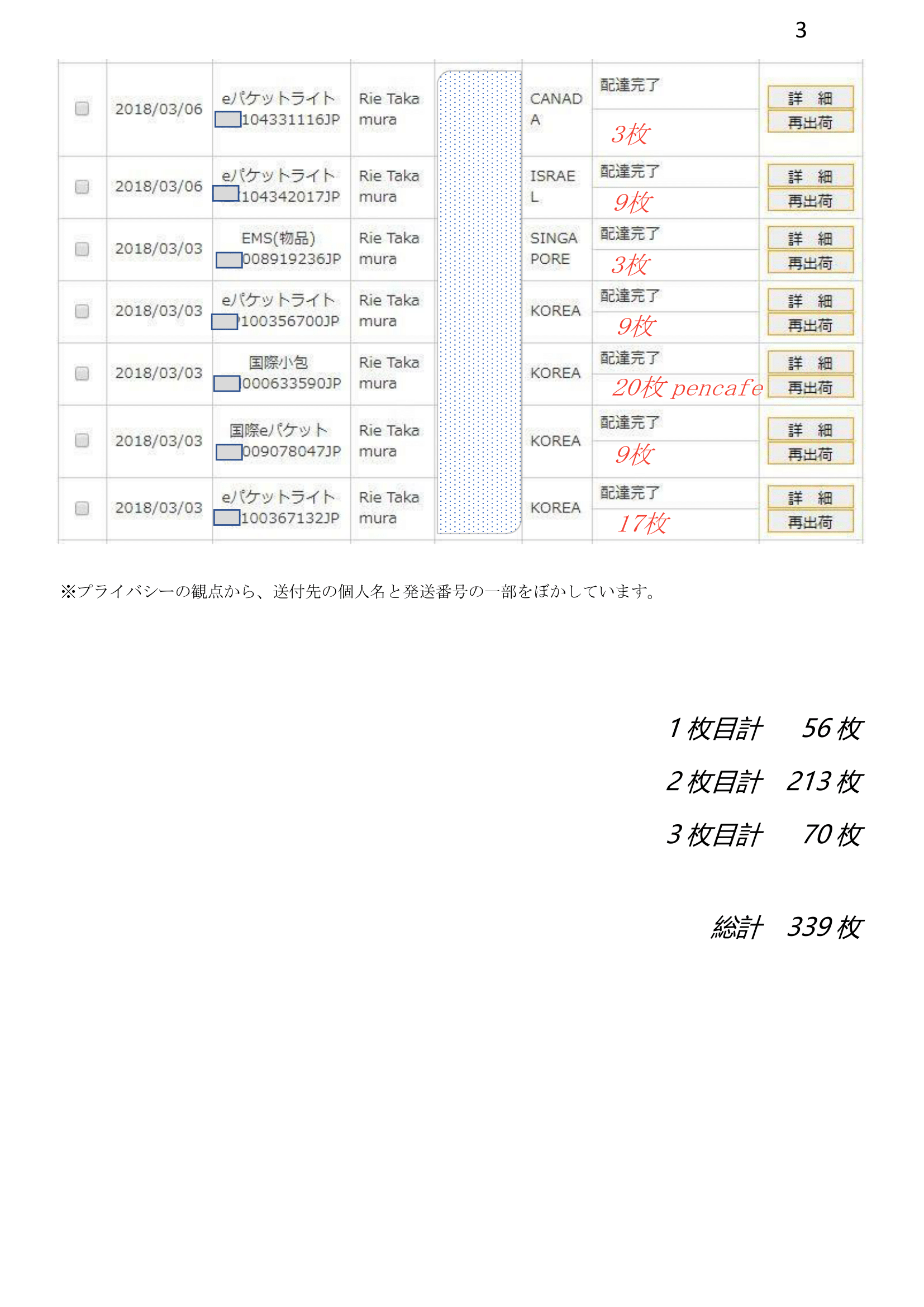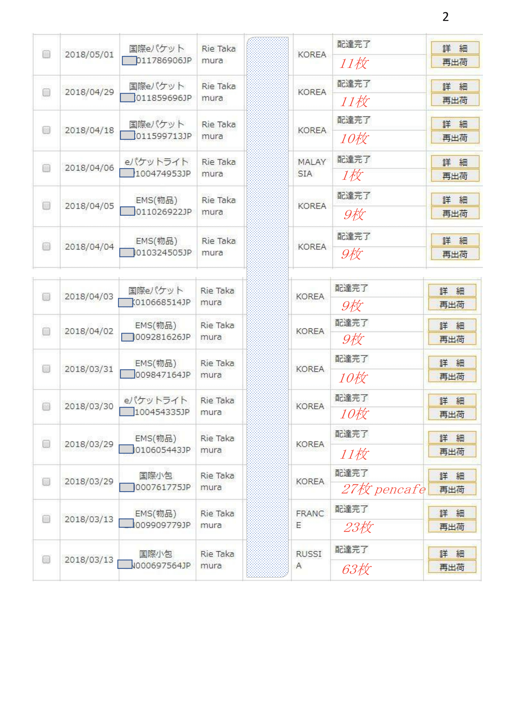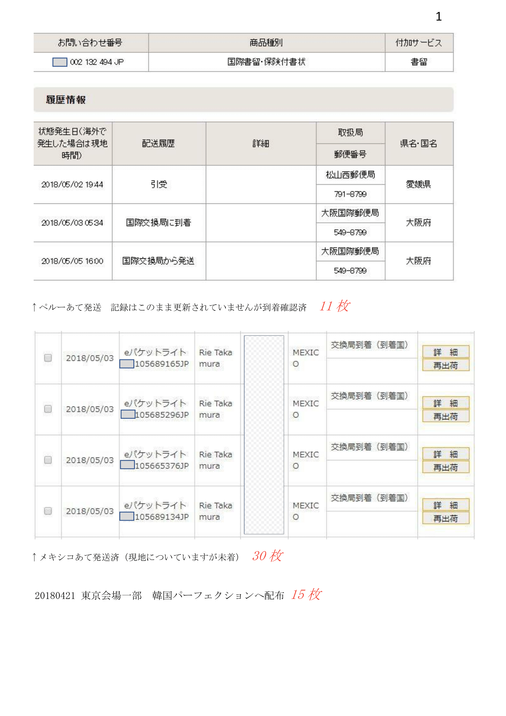 下記は、郵便局の海外送付記録一覧になります。ご確認を下さいますようよろしくお願い申し上げます。
